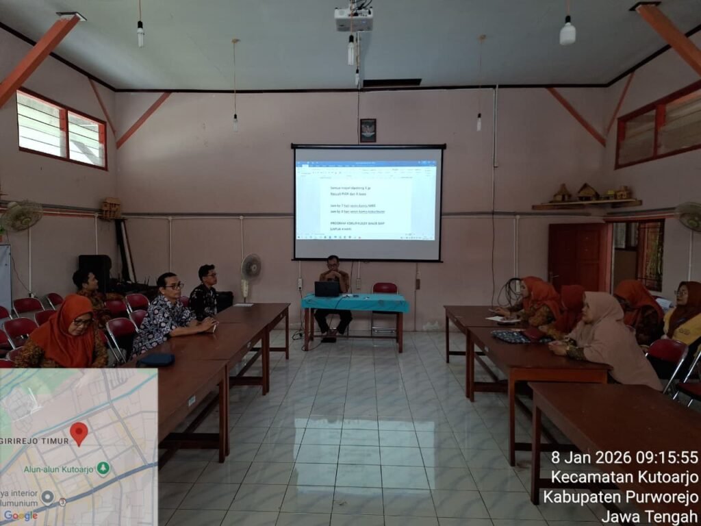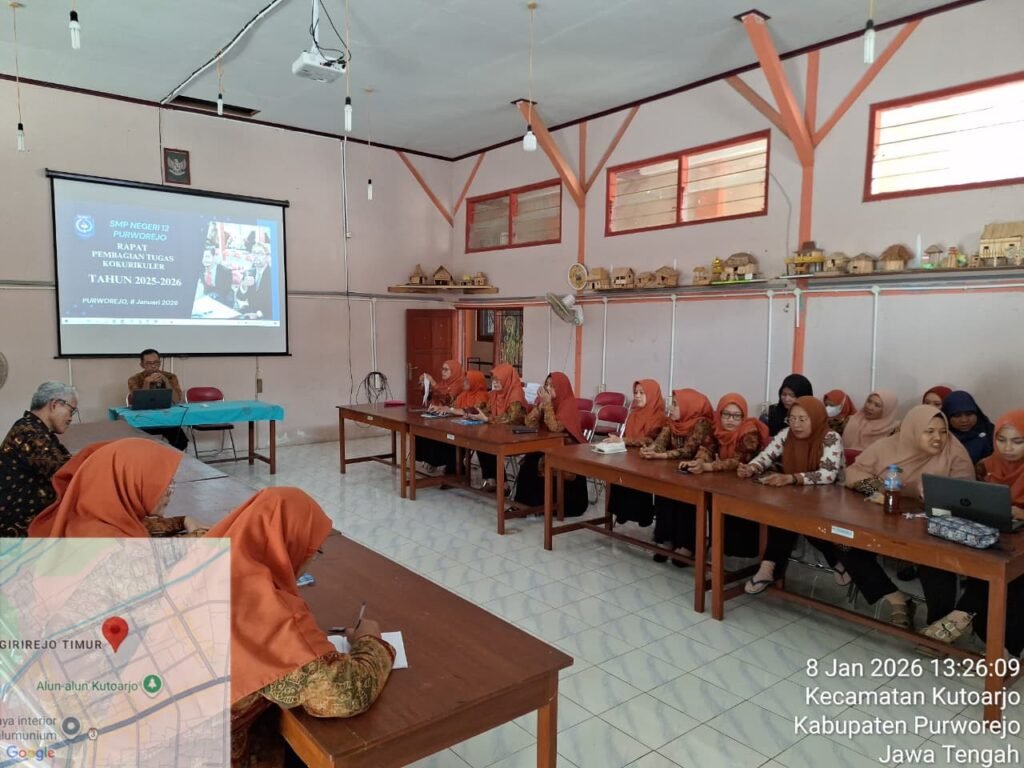 Hari Kamis 8 Januari 2026 telah dilakukan koordinasi tim Kokurikuler yang dilanjutkan dengan sosialisasi kepada bapak ibu guru semua yang ada di SMPN 12 Purworejo dan disepakati pelaksanaan menggunakan metode jadwal yang melibatkan kokurikuler sebagai bagian dari pembelajaran di SMPN 12 Purworejo.
